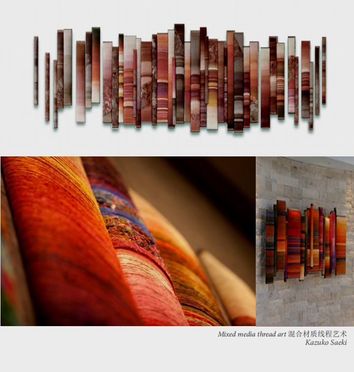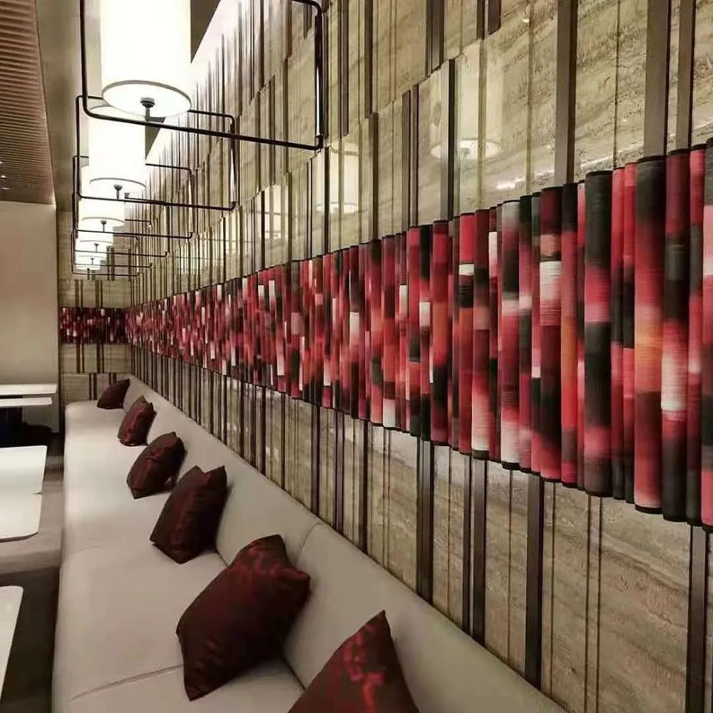 酒店设计的餐厅中延绵的艺术画,用的是传统的手工线工艺,使用一根根木头层层环绕,条条并排,层次分明的同时井然有序的排列,高密度的环绕与颜色的冲击让人眼前一亮,会让人惊讶地发现现代设计中还可以有传统的古韵。